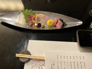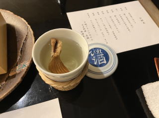 | 夕食付のプランで和食を頼んであった。 食事会場からは、夜の唐戸桟橋や門司の灯りが見え、タワーでは楽しめなかった夕景を楽しむことができた。 下関での和食ということで、まずはひれ酒を。 前菜の盛り合わせに続いて鱧とごま豆腐の清汁、市場直送お刺身三種盛り、鰆の幽庵焼きと提供された。 |