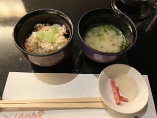 食事は、蟹の炊き込みご飯と味噌汁と香の物。デザートもお菓子とフルーツ。添えられた飲み物は日本茶。 全部平らげても、ほどよい満足感。 下関でふぐ三昧というわけではなかったが、これはこれでいいのでしょう。 |