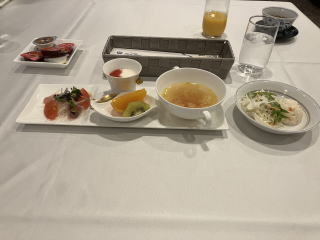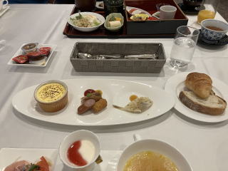 朝食は、チェックインの際に和食か洋食を選べようになっていた。夕食が和食なので洋食を頼んでおいた。 一品一品が小皿や仕切り皿に盛られて提供された。 ビュッフェ方式の朝食が多いが、取り過ぎてしまったり、雑に盛ったりして興ざめのこともあるが、おしゃれな朝食だった。 |