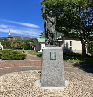 | 空港からトラピスチヌ修道院、五稜郭タワーを経由して函館駅行きのバスが出ている。大回りはするが、途中停車が少なく観光客向けのもの。 バスを降りるとき、運転手さんから修道院南側の市民の森売店で使えるソフトクリームの割引券を渡された。 さすが観光地。 荷物はあるが、トラピスチヌ修道院で途中下車。 門を入ると雄々しいミカエル像が対峙していて、さらに聖母マリア像が迎えてくれる。 その奥には、修道院が見える。 |