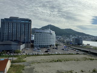 こんな時期なので、フロントでは手指消毒、検温のあと、間隔を空けて並びチェックインをするようになっていた。 チェックインをすませて一息ついてから、函館山への行き方や過ごし方を検討した。 函館山ビューの部屋というのがうたい文句だったが、一番外れの部屋で、国際ホテルが山の中央部までの視界を遮っていた。 とはいえ、函館山の展望台までしっかり見えた。 |