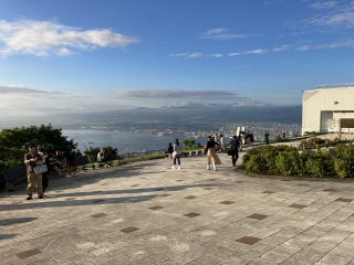 山頂からの眺めは素敵だ。 まだ日が高いのに、展望台には人がどんどん集まってきていた。 夜景に変わるまでの時の流れをゆったりと感じた。 街の明かりがポツポツと灯り始めた頃、下の階のレストランにいくと、15分も待てば展望席で食事ができるとのこと。 席に案内されたときに外を見ると、すっかり夜景に変わっていた。 レストランジェノバで、自分はカットステーキを頼んだ。こんな景色を堪能しながらゆっくり食事ができるとは思ってもいなかった。 |