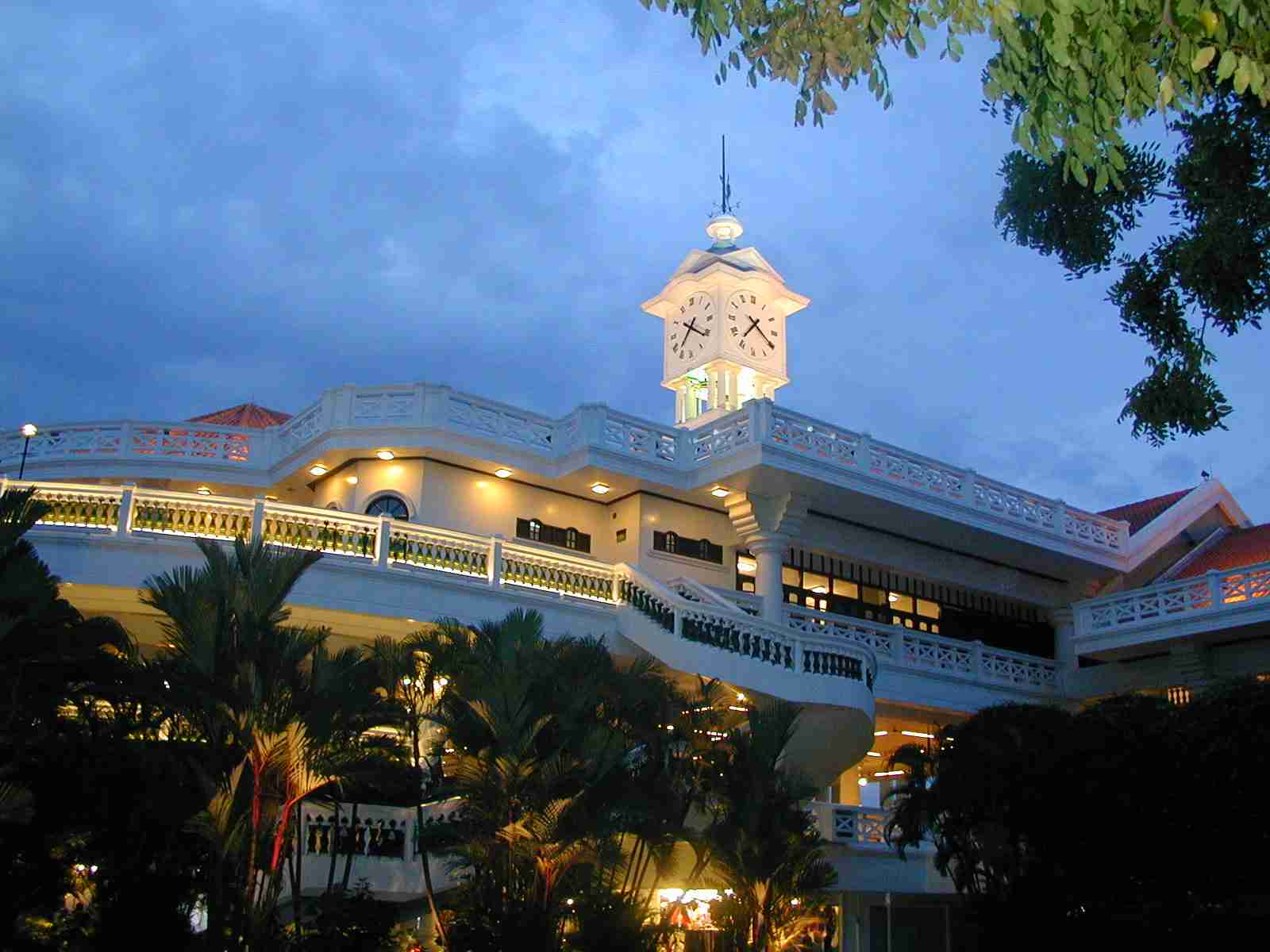 時計台からマーライオンタワーへのプロムナードは これから始まるミュージカル・ファウンテンの序奏曲である。