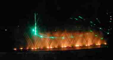 噴水と馬鹿にするなかれ 高さも、吹き出す方向も変幻自在 まさに水のダンス そこへ、レーザー光線が当たると、ショーの空間は目の前を占有する。