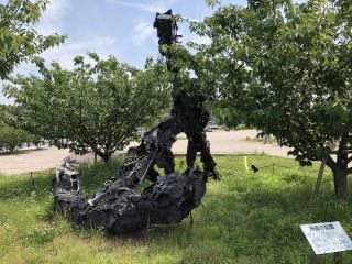 | 宇野港でバスを降りると、そこも瀬戸内国際芸術祭の会場になっていた。 目についたのが、「船底の記憶」という作品と「真庭のシシ」。 船底の記憶は、鍋ややかんなどで錨を形作ってあり、イノシシに至っては、ゴミとして出されたプラスティックの日用品まで使ってあった。 |