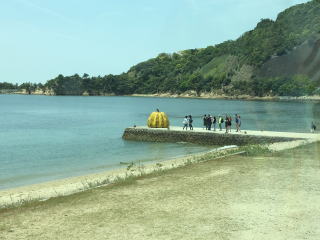 天気もよく、海岸の風景も楽しめた。 突堤に草間彌生の黄色いカボチャがあった。作品を鑑賞する人の姿が窓越しに見られた。 後で立ち寄ることになっている,vベネッセパークの建物も見えた。 |