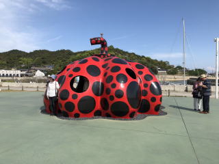 | バスは、宮浦港に向かった。 港には、草間彌生の赤カボチャが安置してある。 このカボチャは、見るだけでなく、中に入ることもできるようになっている。斑点模様のいくつかがくり抜かれているので、その穴から海辺を眺めることもできる。 ここが遊園地だったら、芸術作品がただの遊具の一つになってしまいそう。 |