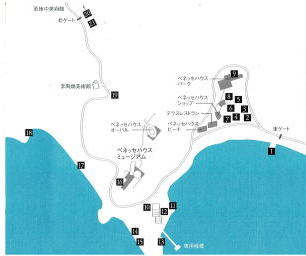 右のマップは、ベネッセの施設内にある屋外作品のリスト。1から21まであり、1⃣は、草間彌生のカボチャ(黄色) ベネッセハウスミュージアムも、ベネッセハウスパークも、敷地内の施設の一つずつなのだ。 |