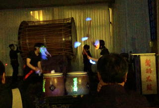 食事は、瀬戸内の海産物をふんだんに使ったもので、 鍋もあるし、〆は炊き込みご飯。 食事後は、ロビーに宿泊客向けに鷲羽太鼓の勇壮な演奏が披露された。 大きな太鼓を、希望者には叩かせてくれたが…。(後は想像にお任せします。) |
