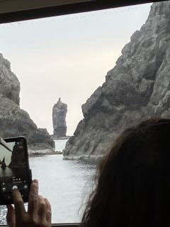 松原のすぐ近くの釜屋桟橋から 貸切渡船で中ノ島に。 中の島での観光を済ませて、 西ノ島国賀海岸めぐりを、 遊覧船でという予定だったが… |